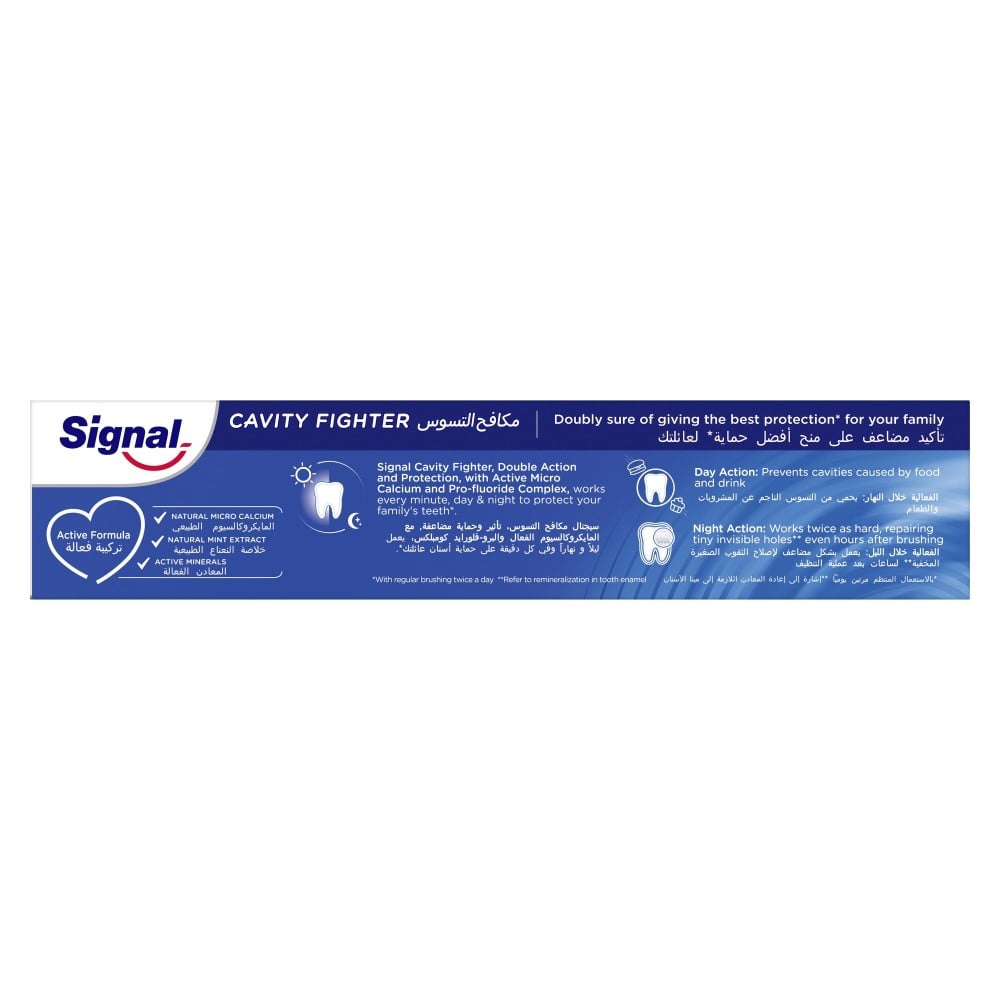 معجون سيجنال مكافح التسوس يساعد في إصلاح علامات التسوس المبكر وذلك لإحتوائه على الكالسيوم والفلورايد الذي يمنح الأسنان القوة ويمنحك نفس منعش. تركيبته الفريدة من الكالسيوم النشط أثبت علميا أنه ينقل 50٪ أكثر من الكالسيوم الى داخل الأسنان مما يجعلها أكثر قوة ومقاومة للتسوس.