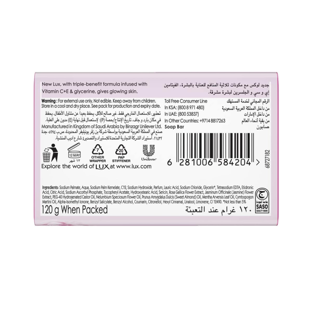 صابون لوكس بشرة نضرة الجديد غني بفيتامين C وE والغليسرين، وهي تركيبة ثلاثية الفوائد تعمل على تفتيح البشرة وتغذيتها وترطيبها لإظهار بشرة متوهجة وناعمة للغاية. غني برغوة كريمية، ومزيج العطر الرقيق من الزهور، رائحة تدوم طويلاً وتبهج الحواس.